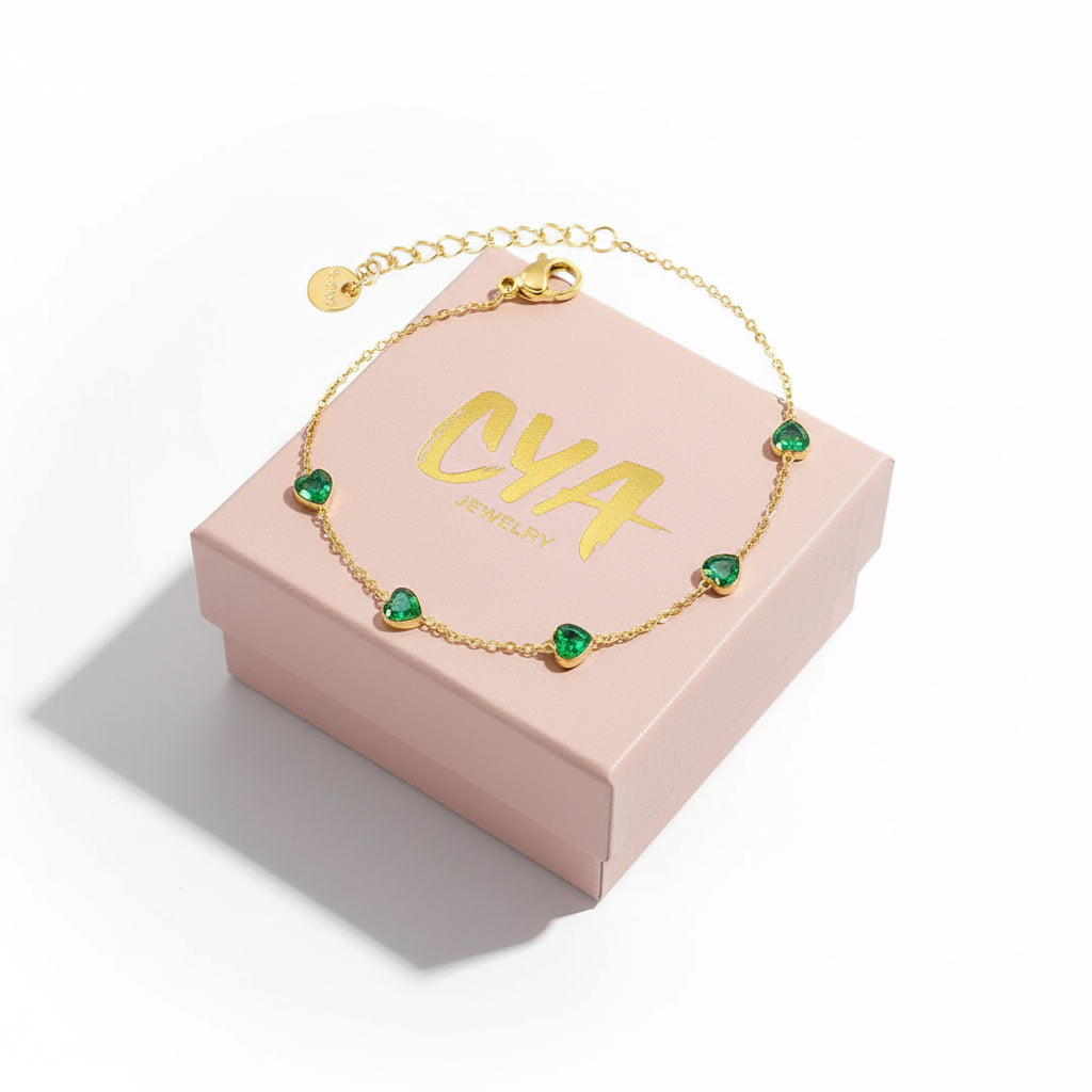 צמיד זהב עדין עדין עם לבבות ירוקים
